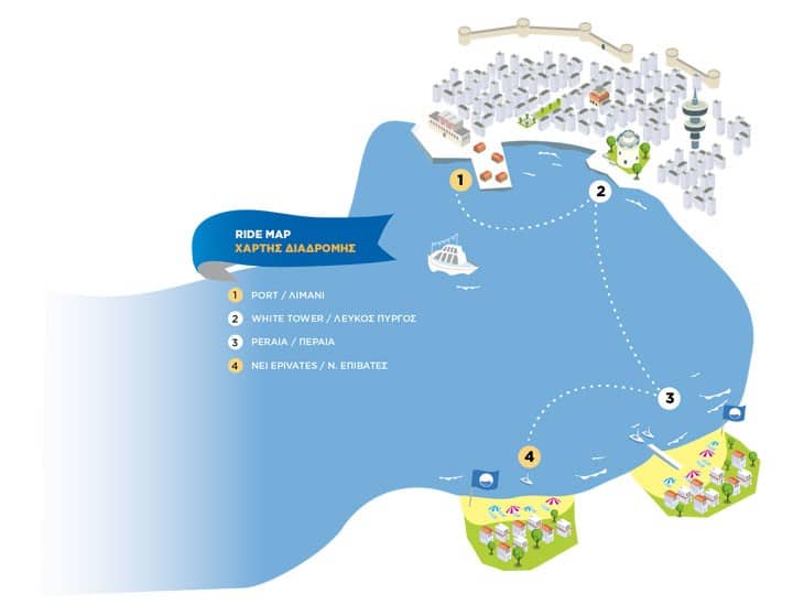 Μια όμορφη διαδρομή στον Θερμαϊκό περίπου 50 λεπτών που εξυπηρετεί τις καθημερινές ανάγκες για μετακίνηση αλλά και για τους τουρίστες που επιθυμούν να να γνωρίσουν και άλλα μέρη εκτός του κέντρου της πόλης.